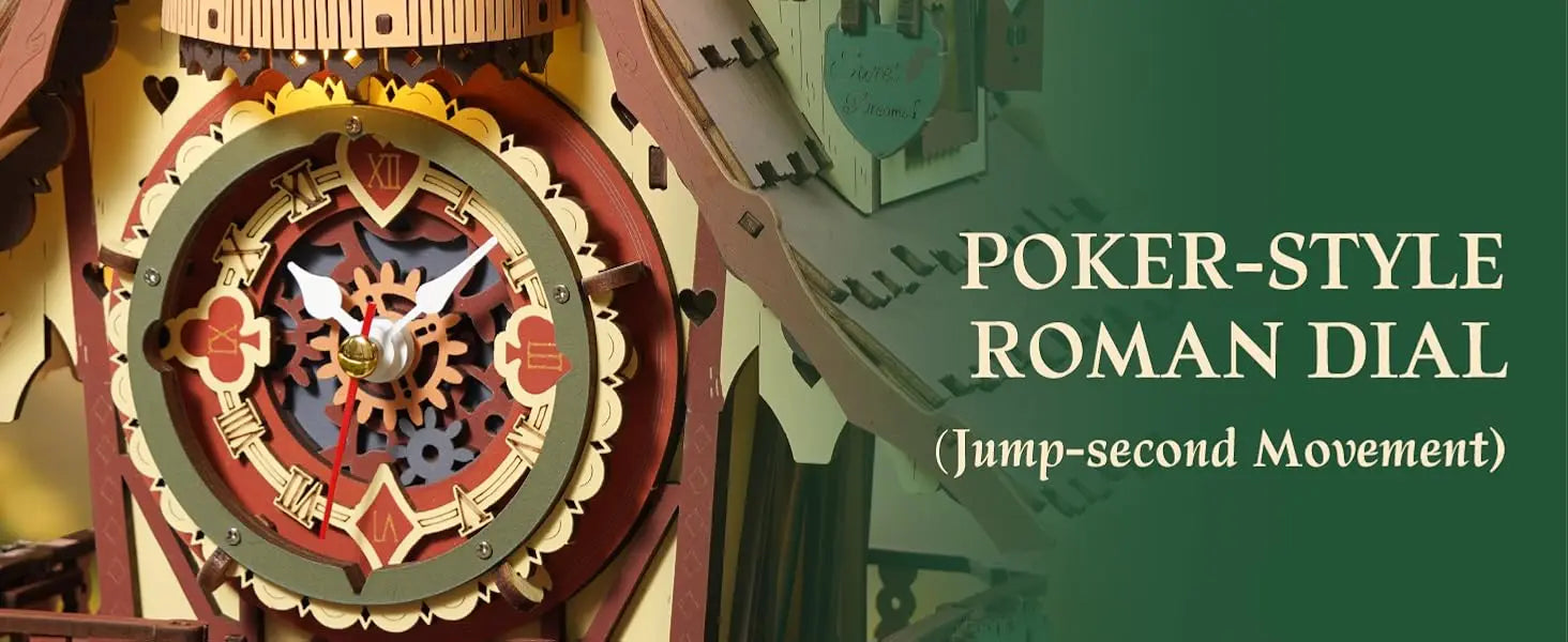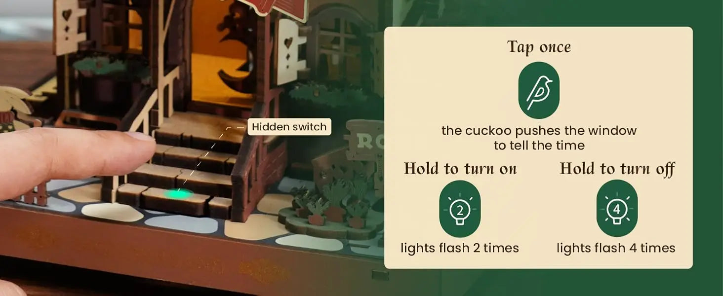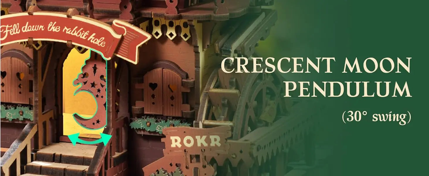 Switch on built-in LEDs for a warm glow. The swinging moon pendulum and Roman clock face create a magical forest scene.